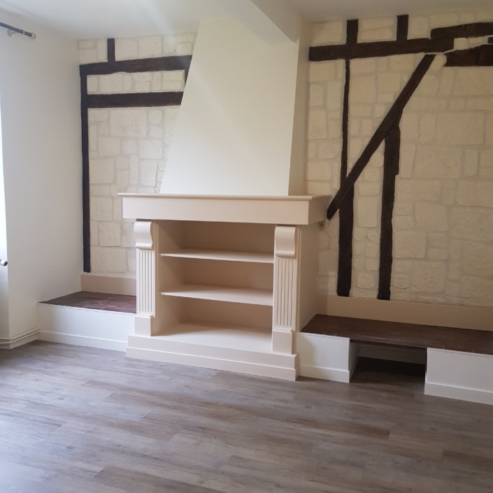 - Habillage de la cheminée en plaque de plâtre, pose d’étagères, nettoyage des pierres,
